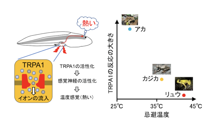本研究では日本在来で、様々な地域に生息する5種の両生類種(カエル)のオタマジャクシについて、それぞれの種のオタマジャクシが嫌いな温度(忌避温度)を調べました。その結果、氷が張るような早春に産卵するニホンアカガエルにおいて忌避温度が最も低く、天然の温泉が流れる沢でも成育できるほどの高温耐性を持つリュウキュウカジカガエルにおいて、忌避温度が最も高いことが分かりました。さらに、高温を感じ取る際に重要な TRPA1(トリップ・エイワン)というセンサー分子を調べたところ、忌避温度が最も低いニホンアカガエルで最も大きかった一方で、忌避温度がもっとも高いリュウキュウカジカガエルの TRPA1 は高温の刺激に対してほとんど反応しませんでした。