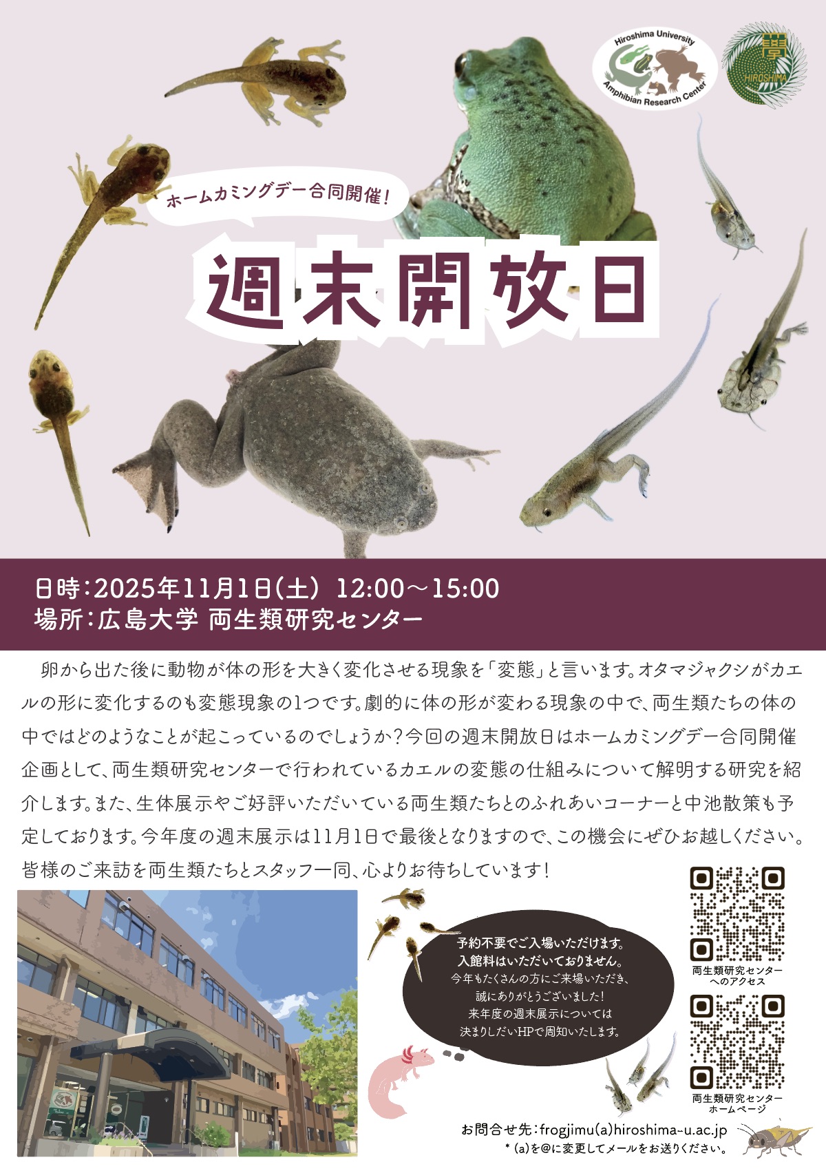 両生類研究センターの次回週末開放日はホームカミングデー合同開催となり、 11月1日(土)12:00から15:00に展示を行います。 合同開催企画として、オタマジャクシから大人のカエルやイモリの体に変化していく変態現象の仕…
