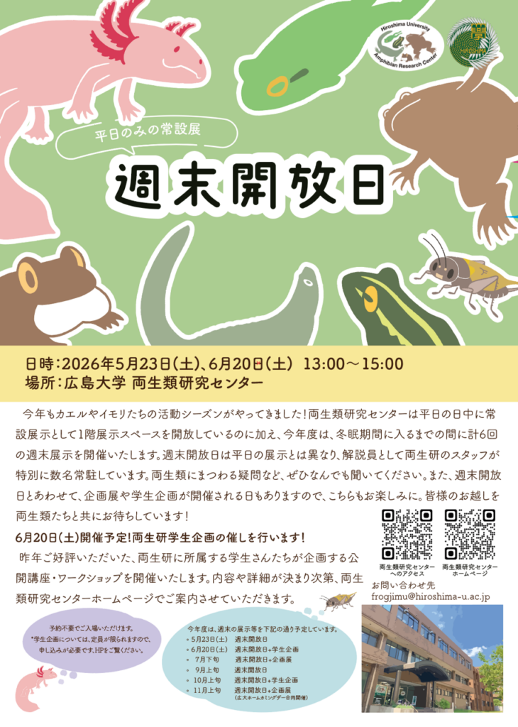 Read More毎年開催している、両生類研究センターの週末展示について、今年の内容が決まりました。 今年は「企画展」一度お休みさせていただき、常設展を週末に一般公開する「週末開放日」を冬が来るまでの期間、計6回設けることとなりました。 …